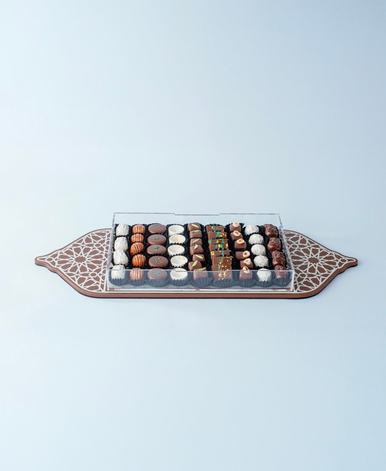 A luxurious tray with an elegant Ramadan-inspired design, filled with best-selling chocolates—ideal for premium gifting and special occasions, with customizable ribbon color options.